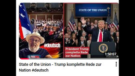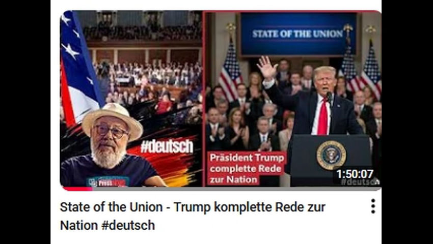 Gestern haben wir euch vier Stunden lang die LIVE-Übertragung der Trump Rede zur Nation - "State of the Nation" übertragen. Für diejenigen unter Euch, die nur die komplette Rede auf deutsch ansehen wollen, haben wir dieses Video der kompletten Rede von Präsident Trump auf deutsch, ohne Vorspann, noch einmal hochgeladen. Vielen Dank fürs teilen.