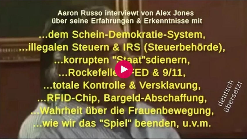 Wahrheit über Demokratie, Steuern, 9/11, Frauenbewegung, Bargeld-Abschaffung, FED, IRS, RFID-Chip u.v.m.Show more Der Regisseur und Produzent des bahnbrechenden Dokumentarfilms "America -- Freedom to Fascism", Aaron Russo, hatte sein Wissen aus erster Hand über die globale Agenda der Elite in einem Videointerview und in der Alex-Jones-Radiosendung enthüllt.